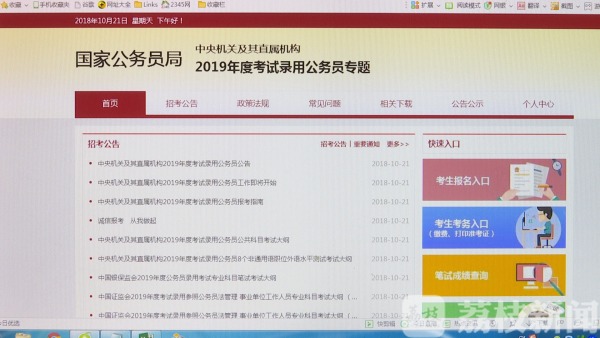 2018年10月21日以后,报考人员可登录国家公务员局门户网站(www.scs.gov.cn)和中央机关及其直属机构2019年度考试录用公务员专题网站(bm.scs.gov.cn/kl2019)查询招考公告、招考职位、报考指南、考试大纲、政策法规等信息。