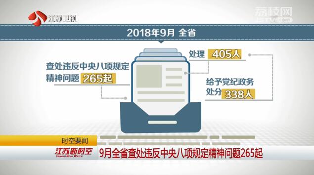 记者10月24日从省纪委获悉,2018年9月,全省共查处违反中央八项规定精神问题265起,处理405人,其中给予党纪政务处分338人。从处理干部级别看,查处县处级干部21人。从查处问题类型看,违规公款吃喝最为突出;其次是违规发放津补贴或福利、以及违规收送礼品礼金。(江苏广电融媒体新闻中心记者/刘承武 黄蒙 编辑/朱一普)