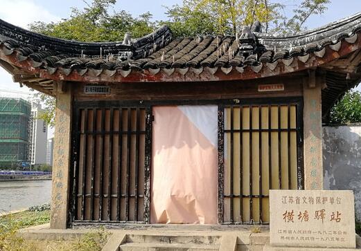 横塘驿站门前的空地上有不少枯萎的野草,大门被一块幕布代替。门口的石碑上写着此处为江苏省文物保护单位。掀开幕布,一条野犬从里面跑了出来,继而消失在了荒地之中。