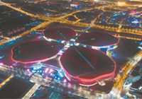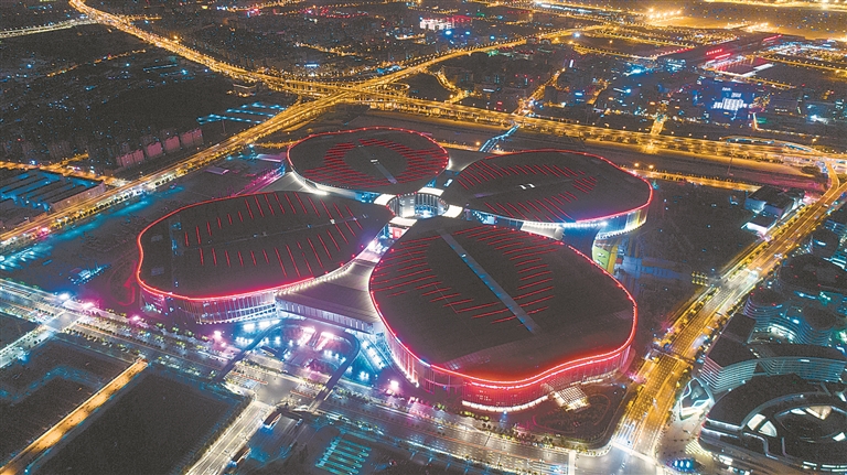 首届中国国际进口博览会主会场上海国家会展中心的配套工程已进入收尾阶段。图为夜空下的国展中心。