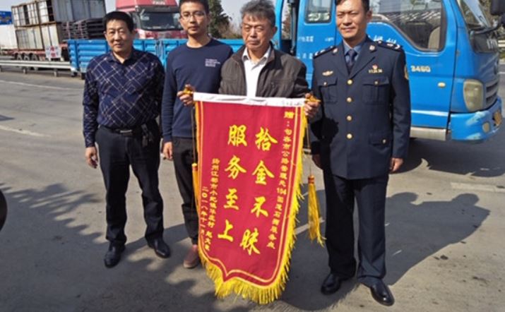 11月2日下午12时40分,扬州江都小纪镇的赵大康从句容公路处104服务点严国宝老人手中接过丢失24小时的手包时,激动不已,连声说谢谢,并送上了“拾金不昧 服务至上”的锦旗。也是这位老严,曾经捡到6万元,守候失主,并婉拒酬谢,竟让失主感动得跪下了。