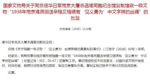 记者注意到, 国家文物局对侵华日军南京大屠杀遇难同胞纪念馆的批文中称,你馆《关于馆藏一级文物“‘见义勇为’丝绸条幅仿真复制的请示》。经研究,同意你馆开展所报馆藏一级文物“1938年南京难民赠送辛格贝格绣有‘见义勇为’中文字样的丝绸”的复制工作。