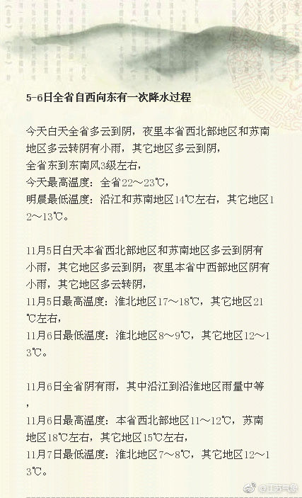 今天白天,全省以多云天气为主,全省最高温度均在22-23度。今天夜里,我省西北部和苏南一带会出现小雨。