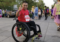 在奥体中心入场处,一个独特的身影吸引了记者的注意,他就是家住南京市六合区的 " 轮椅哥 " 严先生,与其他参赛者不同,严先生将用手 " 跑 " 完全程。
