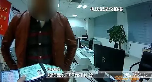 “执法现场:根据《江苏省道路安全条例》第六十八条规定,对你处罚200元不计分。