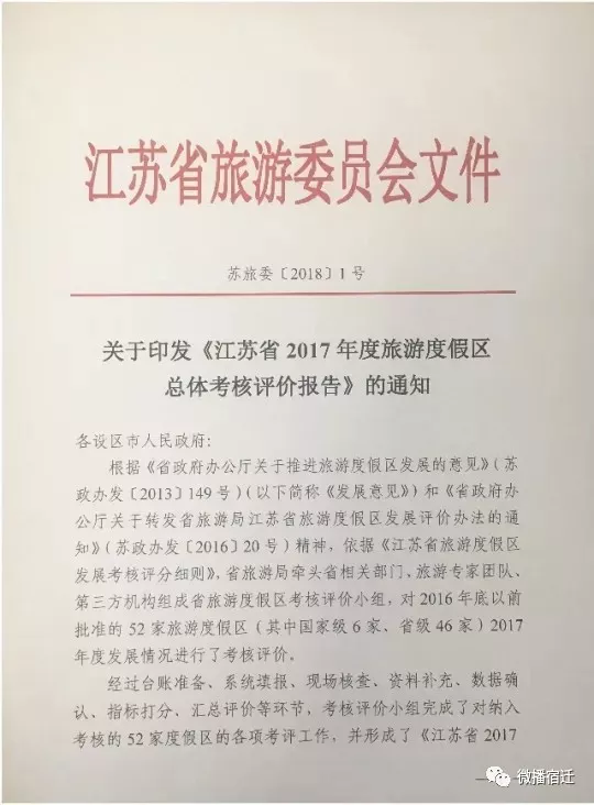 日前,江苏省旅游委员会《关于印发〈江苏省2017年度旅游度假区总体考核评价报告〉的通知》(苏旅委〔2018〕1号),公布2017年度全省52家省级及以上旅游度假区考评结果。宿迁骆马湖旅游度假区、泗洪洪泽湖生态旅游度假区、宿迁洋河旅游度假区、泗阳成子湖旅游度假区,分别在46家省级旅游度假区中排名第8、14、33、40位。
