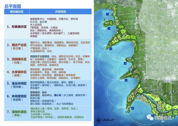 七大功能区:形象展示区、运动休闲区、农耕文化区、水岸森林区、渔事体验区、休闲度假区、湿地科普区。