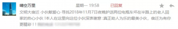 留言者是宿豫区陆集人宋先生,两位受困老人是宋先生的母亲和二娘,而热心小伙在安全护送两位老人回家后,没有留下姓名便离开了。宋先生一家深受感动!宋先生便在宿豫发布后台留言,希望通过这样的真实事件,弘扬文明,传递爱。