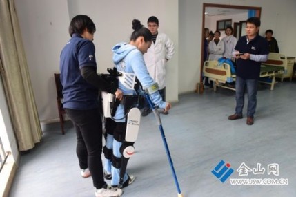 昨天上午,市中西医结合医院康复中心大厅,年轻的截瘫患者王女士,在工作人员的帮助下变身“机甲战士”,体验站立、行走等动作。对这套穿戴式设备,她说:“新奇,很舒服,非常兴奋。”