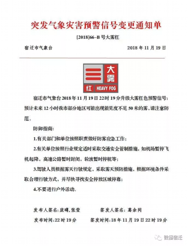 宿迁发布大雾红色预警信号