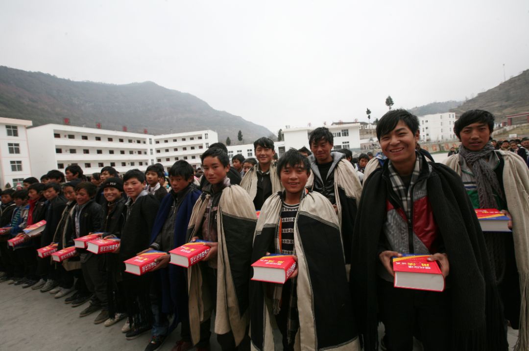 喜获工具书。俄普中学的孩子们免费获得了一本梦寐以求的工具书。2011年12月27日,摄于美姑县俄普中学。