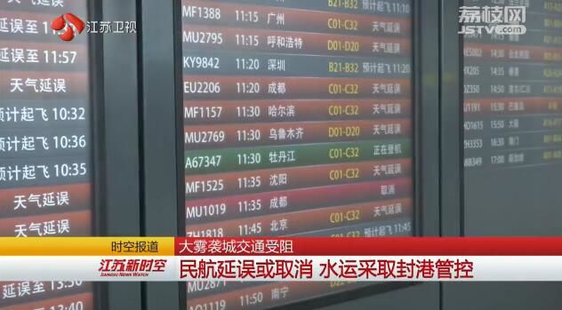 民航方面,受大雾影响,南京禄口国际机场从凌晨2点开始就已不具备飞机起落条件,到今天早间,40多班始发航班延误,大量旅客滞留,部分旅客被安排改签。直到上午10点,南京禄口国际机场航班才陆续恢复正常。常州国际机场、苏南硕放机场等也出现不同程度航班延误,到中午也陆续恢复正常运行。为保障江河水运安全,长江南京段、京杭运河淮安段、泗阳段分别采取封航管控措施,南京三道长江轮渡渡口也已关闭。