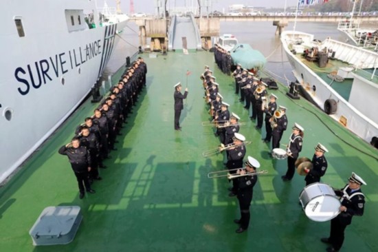 欢迎仪式上,指挥部铜管乐队演奏《忠诚于党》和《指挥部之歌》两首乐曲,欢迎"英雄船"换装归来,中国海监5001船全体人员列队接受检阅。