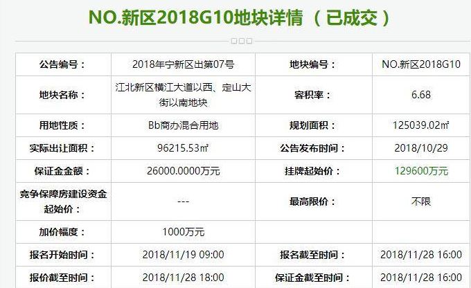 地块地处江北新区横江大道以西、定山大街以南,东至横江大道,南至规划道路,西至万寿路,北至定山大街。出让面积96215.53㎡,规划用地性质为商办混合用地。出让起始价为12.96亿元,保证金2.6亿元。