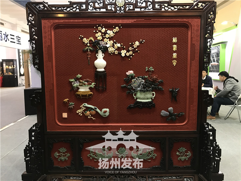 扬州工艺美术集团本次携近20件工艺美术精品参展。其中,国家级非物质文化遗产传承人张宇大师设计的雕漆嵌玉屏风《福寿康宁》贵气逼人,展柜中还摆放了多件玉雕、雕漆、楠木雕以及点螺作品,精美至极。据相关负责人介绍,本次参展的展品都是精心挑选过的,“既要方便展出,也能反映扬州的传统技艺”。
