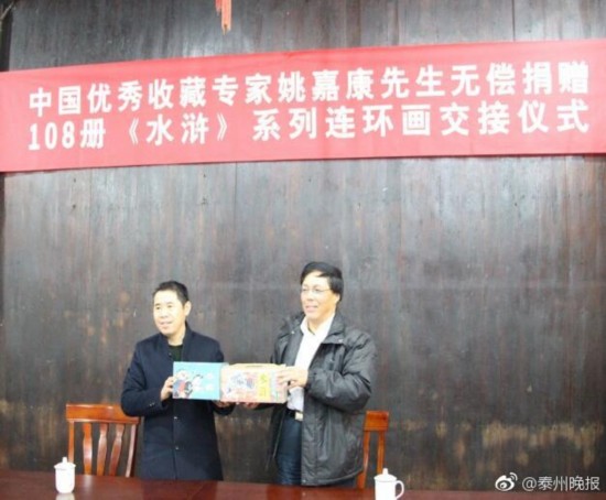 “能把这些连环画捐赠给施耐庵的家乡,特别有意义。”姚嘉康说,他从初中就开始收藏连环画,十多年来,已向全国近300家博物馆、纪念馆捐出约7000册珍贵连环画。前段时间,他从藏友那儿得知施耐庵是兴化人,就跟兴化市博物馆取得联系,想把手里收藏的有关《水浒》的连环画捐赠给施耐庵的家乡,这次终于如愿。