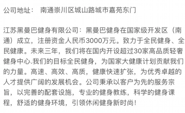 今天(12月1日)早晨,在黑曼巴健身有限公司办了会员卡的众多会员收到了一则消息:“可能因为管理不善,黑曼巴健身的老板跑路了!兄弟姐妹们,快去追讨你们会员卡里充值的钱!”
