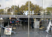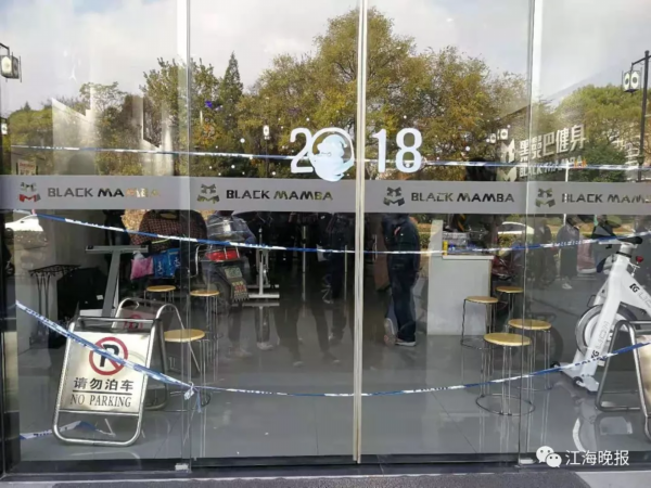 记者在现场看到,黑曼巴公司大门前已拉起了警戒线,外墙上不知是谁张贴了两张白纸,上面印着“黑曼巴维权群”字样,还有微信二维码。