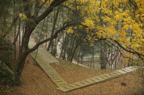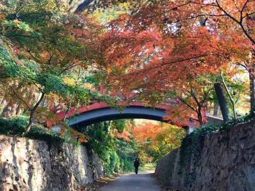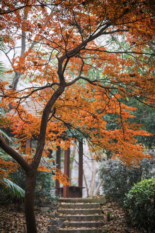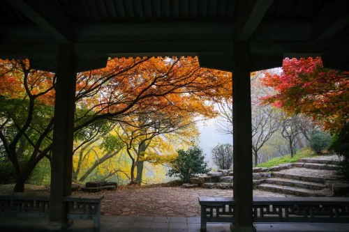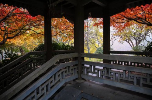 清凉山北面的古林公园可谓闹中取静,园区不大,但四季景色丰富。这里红枫相对集中,亭台楼阁在几株红黄相间的枫树下更显韵味。