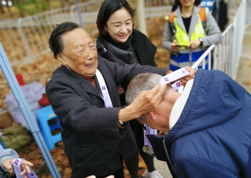 结束了八公里的徒步活动,回到南京师范大学随园校区时,徒步活动的参与者发现夏淑琴老人出现在颁奖现场,老人亲手给每一个参与者戴上和平纪念牌。每戴上一个牌子,老人都会说一句“谢谢你们”。当克里斯·马吉出现在夏淑琴老人面前时,夏淑琴老人久久握着克里斯·马吉的手不愿意松开。