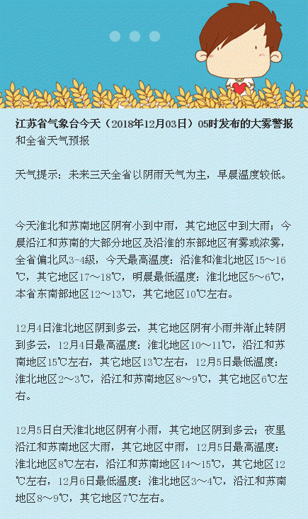根据江苏气象,【未来三天全省以阴雨天气为主】今天淮北和苏南地区阴有小到中雨,其它地区中到大雨;今晨沿江和苏南的大部分地区及沿淮的东部地区有雾或浓雾,全省偏北风3-4级,今天最高温度:沿淮和淮北地区15~16℃,其它地区17~18℃,明晨最低温度:淮北地区5~6℃,本省东南部地区12~13℃,其它地区10℃左右。