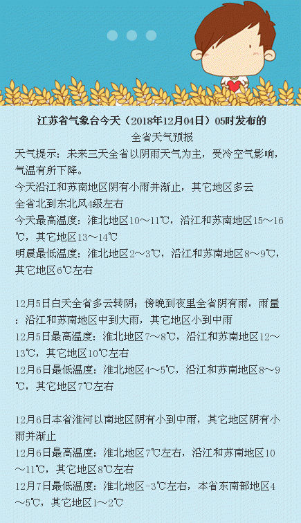 今天沿江和苏南地区阴有小雨并渐止,其它地区多云,全省北到东北风4级左右,今天最高温度:淮北地区10~11℃,沿江和苏南地区15~16℃,其它地区13~14℃,明晨最低温度:淮北地区2~3℃,沿江和苏南地区8~9℃,其它地区6℃左右。