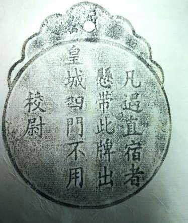 此次征集到腰牌出自南京明故宫遗址,腰牌为铜质,主体为圆形,直径8.7厘米,上部有简化的莲叶盖装饰,中间有一圆形穿孔,以备系绳悬挂。腰牌正面边缘部分有一圈凸起的弦纹,中间有“凡遇直宿者 悬带此牌出 皇城四门不用 校尉”四行十八字阳文楷书,背面光素无纹。
