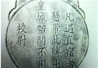 此次征集到腰牌出自南京明故宫遗址,腰牌为铜质,主体为圆形,直径8.7厘米,上部有简化的莲叶盖装饰,中间有一圆形穿孔,以备系绳悬挂。腰牌正面边缘部分有一圈凸起的弦纹,中间有“凡遇直宿者 悬带此牌出 皇城四门不用 校尉”四行十八字阳文楷书,背面光素无纹。