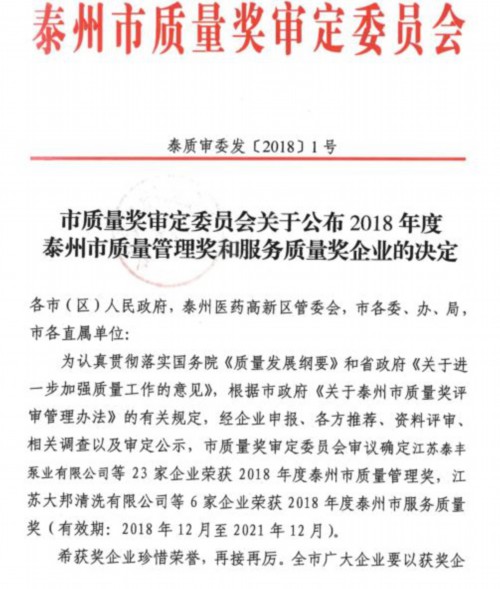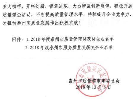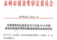 「2018年泰州市质量管理奖单位公示名单(排名不分先后)」