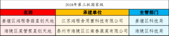 近日,科技部对第三批国家级星创天地备案名单进行了公示,江苏省共备案24家,泰州市“姜堰区鸿程香菇星创天地”和“海陵区菜管家星创天地”名列其中。至此,泰州市已实现国家级“星创天地”市(区)全覆盖。