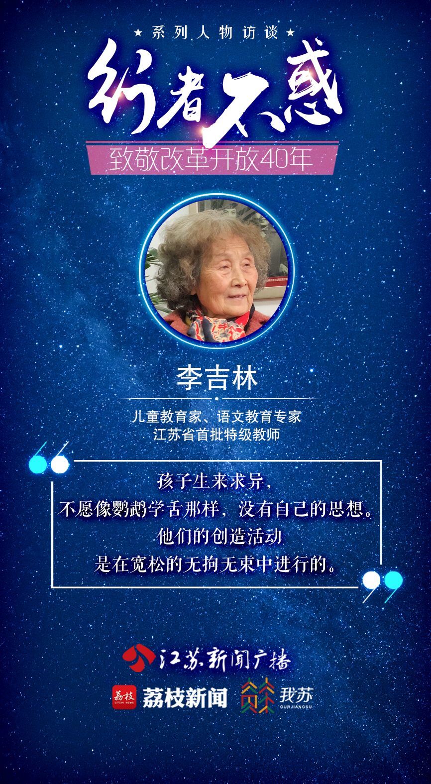 美文:听众朋友,欢迎收听江苏新闻广播致敬改革开放40年访谈节目行者不惑,我是美文。 我们都知道教育是改革开放的先声,也是改革开放的重要组成部分,这40年来教育发生了哪些变化?又带给我们每一个普通人怎样的影响?今天我们有幸邀请到的是从教60载,在中国当代杰出的儿童教育家李吉林老师,李老师,您好。李老您从事这个教学60多年了,可以说您是见证了改革开放40年来教育的发展和变化,那今天我们想邀请您带着我们一起来感受这40年教育的一些创新和一些发展。那我们知道您是出生在南通,当年呢是放弃了上大学的机会,走进了当时的南通女师附小,就是现在的南通师范第二附属小学。那之后从小学到中学,您一直是在语文教学的第一线。那能不能先请您给我们说一说,当时您为什么会选择老师这份工作?在您的眼中,老师这两个字意味着什么呢?