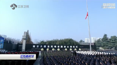 纪念馆集会广场庄严肃穆,现场国旗下半旗。广场西侧的"灾难墙" 上,灰黑的底色映衬着"南京大屠杀死难者国家公祭仪式"14个白色大字。8000余名各界代表胸前佩戴白花,静静肃立。解放军仪仗大队18名礼兵齐步行进至公祭台两侧伫立。