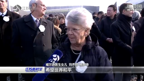 威尔逊医生女儿、玛乔丽·格奈特说,我很荣幸今天来参加公祭仪式,希望世界和平,希望世界各处没有硝烟,大家共同构建人类命运共同体,让爱和友善去替代仇恨和战争,人们心中传递和平的信念。