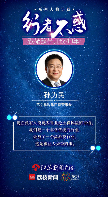 汪玲:各位好,这里是改革开放40年人物访谈——行者不惑节目,我是汪玲,今天我们访谈的嘉宾是苏宁易购集团副董事长孙为民先生。