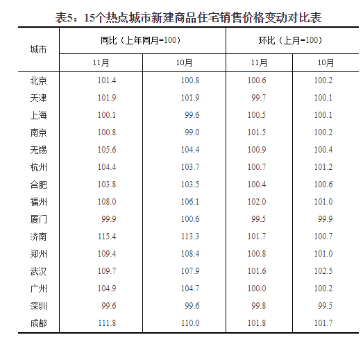 11月份,15个热点城市新建商品住宅销售价格环比下降的城市有3个,比上月增加1个,最大降幅为0.5%;持平的1个,增加1个;上涨的11个,减少 2个,最高涨幅为2.0%。同比下降的城市有2个,比上月减少1个,最大降幅为0.4%;上涨的13个,增加1个,最高涨幅为15.4%。