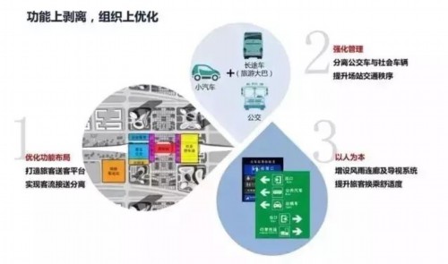 此次改造将以安全、便捷、流畅、优美、经济为目标,功能上进行剥离,组织上加以优化。即优化功能布局,打造旅客送客平台,实现客流接送分离;强化管理,分离公交车与社会车辆,提升场站交通秩序;以人为本,增设风雨连廊及导视系统,提升旅客换乘舒适度。