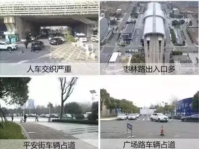 公交车场中混入社会车,人车交织,秩序混乱;枣林路出入口多,交通组织混乱;交安监控设施配套不足,存在黄牛拉客、路边乱停乱靠现象;