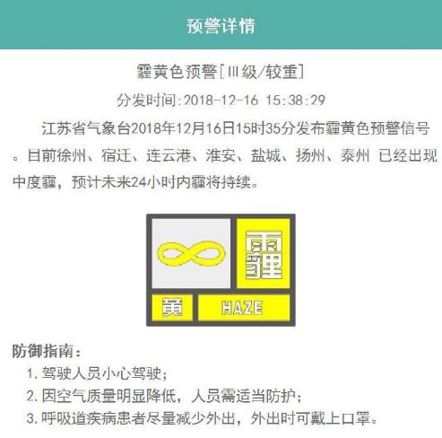 今天省气象台2018年12月16日15时35分发布霾黄色预警信号。目前徐州、宿迁、连云港、淮安、盐城、扬州、泰州 已经出现中度霾,预计未来24小时内霾将持续。