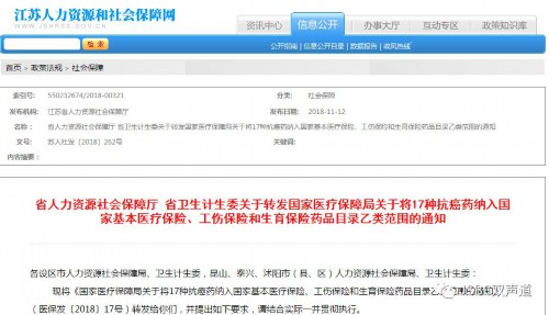 2018年11月12日江苏省人力资源社会保障厅下发通知,要求我省各地要将医疗机构采购、使用、配备谈判药品中抗癌药的情况,患者投诉举报情况等纳入医疗保险协议管理内容。各地卫生计生部门要将谈判药品中抗癌药品费用另外统计,不纳入医疗机构药占比考核范围;医疗机构是处方药采购和使用的主阵地,要优化医院药品采购目录,按需采购使用谈判药品中抗癌药,保障患者安全使用到抗癌药品。