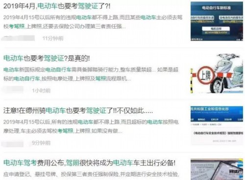 13日,有微信公众号发布信息称:“我国颁布了新的电动车国标,将于2019年4月15日开始正式实施,2019年4月15日以后所有的违规电动车都不得上路,而且电动车主必须去驾校考驾照,上牌照,还要去保险公司办理第三者责任强制险。如果没有做到以上的几点,骑着电动车上路被抓到一次就要罚2000元。”