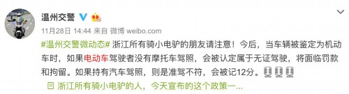 小编查询相关信息发现,11月28日,温州交警官方微博确实发布过相关信息,消息称,今后,当浙江的“小电驴”被鉴定为机动车时,如果电动车驾驶者没有摩托车驾照,会被认定属于无证驾驶,将面临罚款和拘留。如果持有汽车驾照,则是准驾不符,会被记12分。
