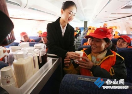 金山网讯 寒风凛冽,但这里春意融融。昨天上午,百名环卫工人来到江苏航院,在这里第一次登上大飞机,乘坐大飞机,享受“头等舱”服务,还过了一次温馨的集体生日。虽然天气寒冷,可环卫工人的嘴角洋溢着温暖的笑意。