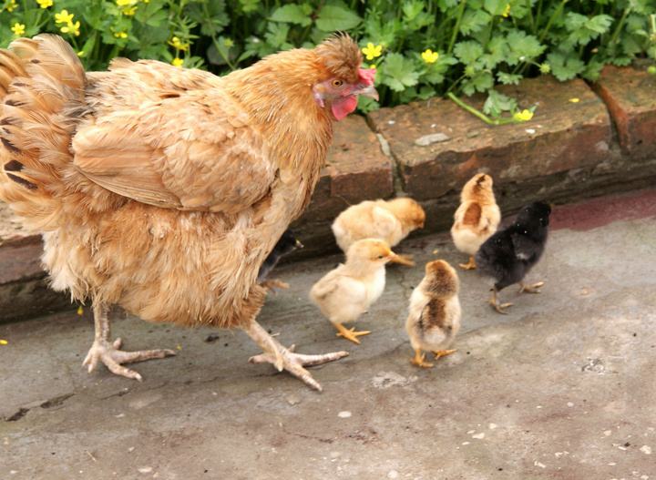 近几天,家住宝堰镇西菜园村的黄鹏飞家发生一件稀奇事:近一个月前失踪的母鸡回来了,还带回一窝叽叽喳喳的小鸡。