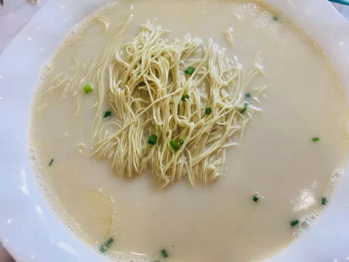 如果你去泰州,一定要品尝这里的鱼汤面哦。雪白雪白的鱼汤里加上一些翠绿色的葱花,简直就是“绝配”。捧着一碗鲜香的鱼汤面,将面条就着汤水塞入口中,只觉得面条爽滑、柔韧弹劲、汤汁浓郁、鲜香回味,再顺势喝上一口浓汤,更让人回味无穷。抿了一口茶,只觉得口中鲜香的滋味久久不能散去。对于游客来说,真的是让你“吃一碗,想三年”。