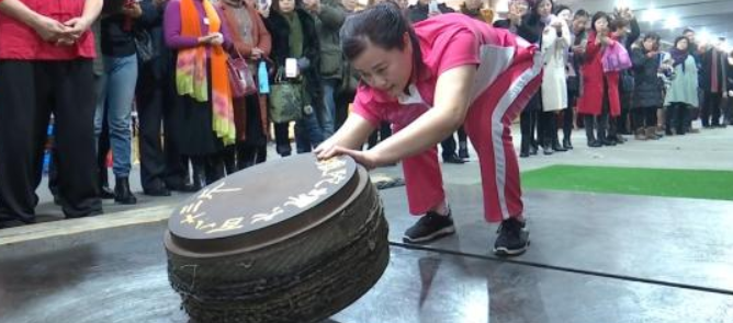 挑战开始前,683斤的陀螺放在特制的、厚度约2公分的钢板上,很多市民都跃跃欲试。不过,无论男女都败下阵来,陀螺纹丝不动。眼前的情景让人为孙继琴捏了把汗。今年50岁的孙继琴是一名旗袍秀爱好者,同时也是一名广场舞教练员,这样一名柔弱的江南女子和打陀螺结缘,还是在今年的11月29号。当时,抱着试试的念头,孙继琴在汤友常的指导下,抽动了30斤重的陀螺,从此产生了兴趣。