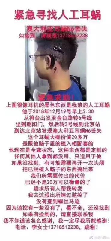 12月19日,网友李女士微博发帖称,其弟在北京乘地铁时丢失20万的人造耳蜗,不少网友转发招领信息,启动“全城大搜寻”。