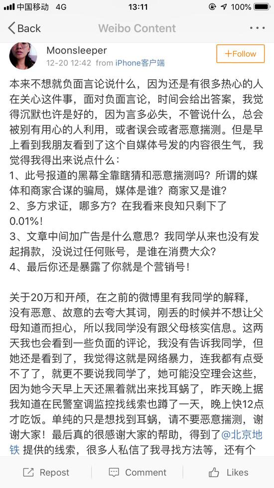 针对网络上流传的“商业合作”“营销手段”等质疑,@Moonsleeper 并不认同,并发表微博说,“面对负面言论,时间会给出答案,不管说什么,总会被别有用心的人利用。希望不要被网络暴力吧,本来丢了就挺糟心的,还被各种骂。”