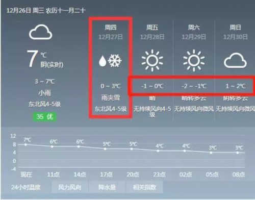 27日全市阴有时有小雨或小雨夹雪,最低气温1℃到2℃,最高气温5℃左右;