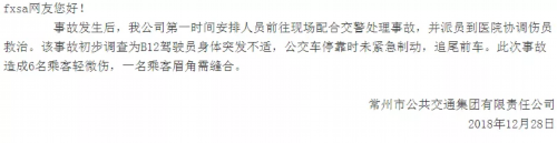 常州公交集团公司也作出回应:事故发生后,公司第一时间安排人员前往现场配合交警处理事故,并派员到医院协调伤员救治。该事故初步调查为B12驾驶员身体突发不适,公交车停靠时未紧急制动,追尾前车。此次事故造成6名乘客轻微伤,一名乘客眉角需缝合。