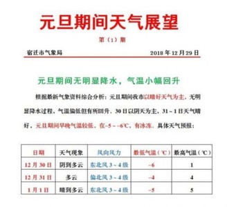 2018年已余额不足,马上就要迎来元旦啦!这个月,太阳君基本上就没怎么干活,为了年底冲业绩,元旦期间宿迁市以晴好天气为主,无明显降水过程,气温偏低但有所回升!